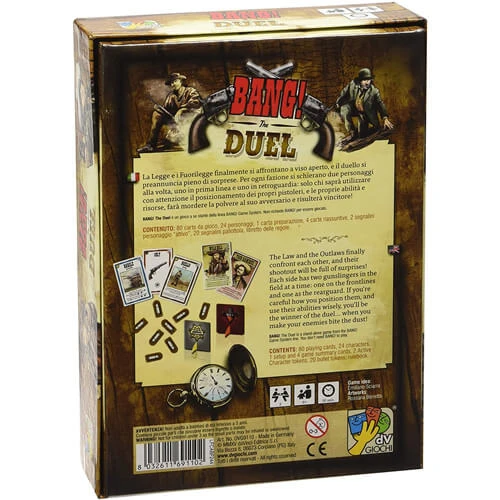 BANG! The Duel is a two-player version of BANG! in which each player chooses a certain number of characters from a personal deck, with one deck containing lawful individuals and the other one outlaws; the more characters you choose, the longer the game. Each player starts with two characters in play, with one being in front of the other.