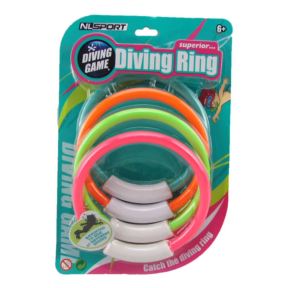Four bright coloured dive rings (weighted to dive at different speeds).