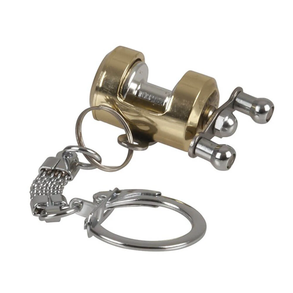 This cute little device features a gold anodised overhead style reel with oversize winding handles, held by a braided chain and nickel plated sharp ring. It is a great small gift for the fishing tragic.