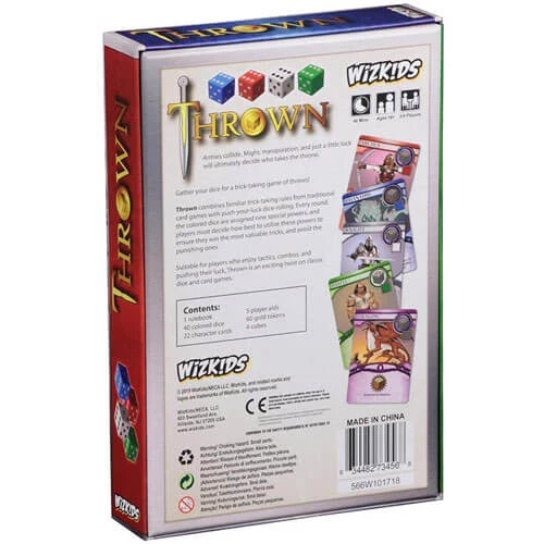 Many are familiar with the idea of a trick-taking game: cards are played, with suits mattering, and you are trying to get the highest value on the table. Sometimes there are trumps which override the suits. In Thrown, the way to play into a trick is by using dice! The colors of the dice represent the suits. The lead player rolls 1-3 dice of a color (the suit) and the other players try to roll in-suit to get the highest value on the table. If you do not have the right suit, then you can roll for trump: rolling a natural 6 on one of your dice in an off-suit will beat the highest value in-suit. Winning a trick gives you gold. The game ends when there are a number of rounds played equal to the number of players. The winner is the player with the most gold. But wait, there are cards in the game too! These cards give special abilities which are paid for, or activated with, dice of particular colors. Some of the effects include: flipping your or your opponentâ™s dice to their opposite sides, removing dice, re-rolling dice, automatically winning with a particular roll, and more!