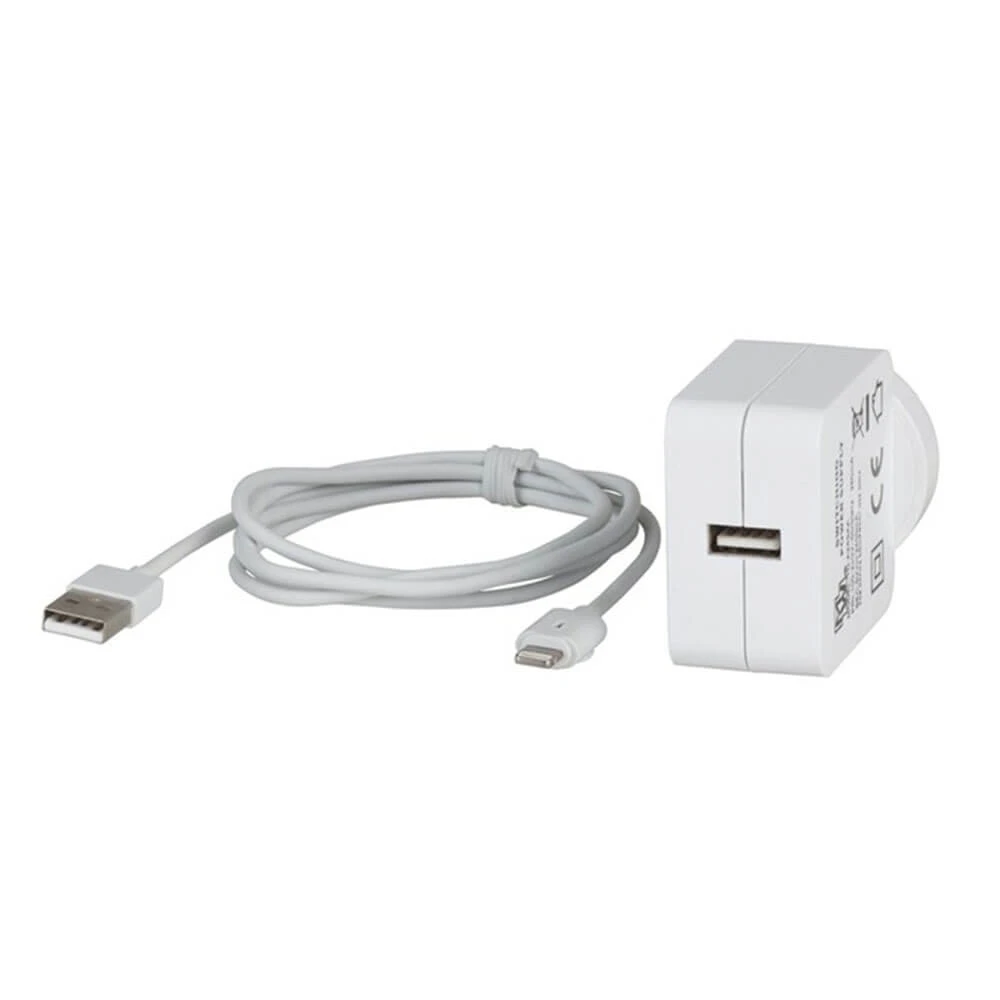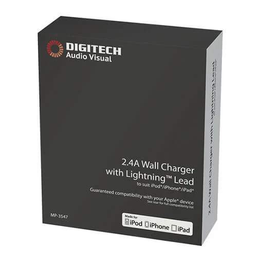 Never have charging compatibility issues with your Apple(R) device with Lightning connector again. This 12W (2.4A) mains wall charger is licensed under the Apple(R) MFi program (made for iPad(R), iPhone(R), iPod(R)), so it is fully compatible with all Apple(R) devices with a Lightning(TM) connector, even taking into consideration any future iOS(R) updates and future model releases. The main charger has a single USB output socket, and is supplied with a 1m Lightning(TM) charge and sync lead which you can also use to sync your device to your home computer.